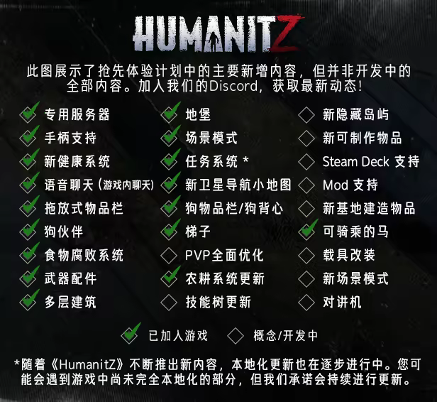 單人遊戲、合作模式、PVE、PVP、專屬伺服器、9種語言、近距離語音聊天、狗伴侶及更多功能